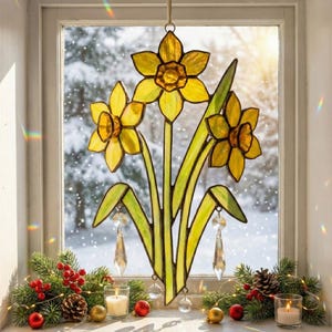 Stained Glass Daffodil Suncatcher, March Birth Flower Gift, Gift for Mom, Floral Window Hanging Decor